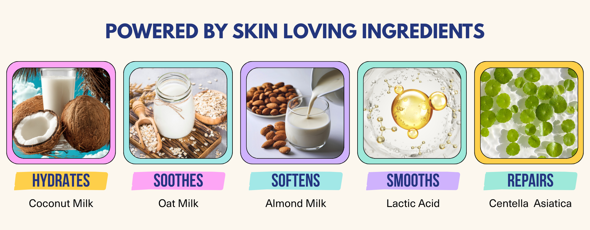 A hydrating body wash with cleansing agents made from coconut derivatives with nourishing plant-based milks that effectively cleanse and balance skin's pH, keeping it feeling soft and conditioned. Feels like having a fragrant bath with milk everyday!
